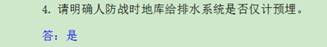 答:战时使用的给水引入管(防护密闭套管和阀门)、口部的冲洗龙头(防护套管密闭和阀门)、电站内的给排水管线、平时均应安装到位,其余给水管平时不安装(如箭头处)。