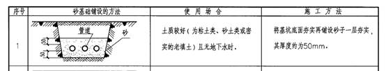 答:采用砂基础的铺设方法,将基坑底面夯实再铺设砂子一层夯实,其厚度约为50mm,详见图集05X101-2第25页。