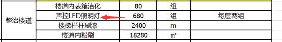 4、安装工程:包含楼梯间照明工程、路灯工程、智能化工程、充电桩管道预埋、弱电线路整理、楼道内表箱洁化、电梯按钮更换、雨水管改造、完善消防设备等;