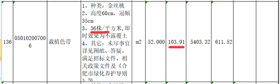 回复:合肥师范学院-室外附属工程金丝桃规格为25株/m2,投标人按照25株/m2自主报价,清单不调整。如下表,合肥师范学院-室外附属工程此项栽植色带综合单价由103.91元/m2调整为106.65元/m2。