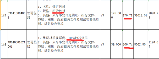 回复:如下表,管道包封综合单价176.71元/m3调整为409.09元/m3;第144项管道垫层综合单价206.74元/m3调整为409.96元/m3。其他小区相同子目统一按此调整。