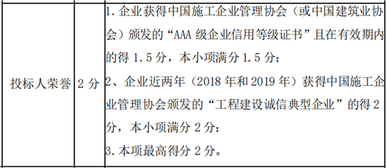 4、关于招标文件2.2.31)业绩、奖项、荣誉---投标人荣誉---第二条:企业近两年(2018年和2019年)获得中国施工企业管理协会颁发的工程建设诚信典型企业的得2分,本小项满分2分。