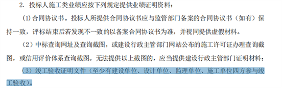 回复: 按招标文件执行。投标人施工类业绩的竣工验收证明文件(至少有建设单位、设计单位、监理单位、施工单位四方参与竣工验收)。