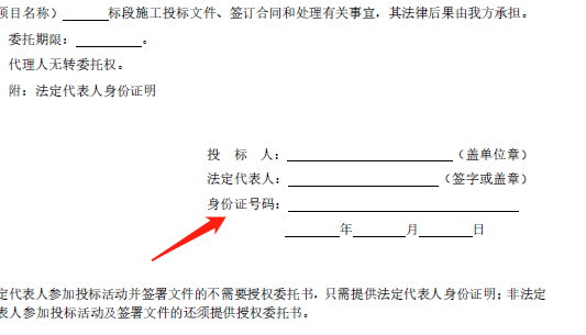 答:招标文件第八章投标文件格式中授权委托书此处为“身份证号码”,现调整为“代理人身份证号码”,各投标人按此执行。招标文件补疑6中投标人疑问答复第6条作废。