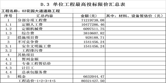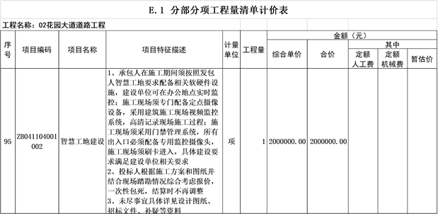 本项目02花园大道道路工程工程量清单第95,项目编码: ZB041104001002,项目名称:智慧工地建设,综合单价变更为2000000.00元。具体修改如下:
