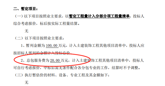 答:本项目总承包服务费以此表述为准:最高投标限价中总承包服务费为20.00万元,计入土建装饰工程其他项目清单中;投标人可自行考虑报价,中标后需无条件配合各分包专业的工作,结算时不予调整。特此说明!