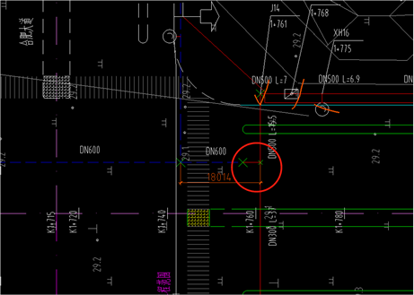 答:此处三通型号为球墨铸铁三通(DN600×DN500,三通下边再接一个双承渐缩管(DN500×DN300