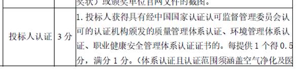 建议修改为:投标人具有 ISO 质量管理体系认证证书、环境管理体系认证证书、职业健康安全管理体系认证证书得3 分。