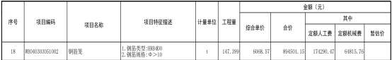 答:圣泉西路--岱河桥工程中清单第18条,钢筋笼项目特征“1.钢筋类型:HRB400;2.钢筋规格:Φ>10”工程量为147.399吨。招标控制价中该清单未计价,现已修改综合单价由0元/t改为6068.57元/t,投标人对该条清单结合图纸自行报价。