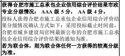 获得合肥市施工总承包企业信用综合评价结果市政专业分级情况:AAA 级5分,AA 4分。