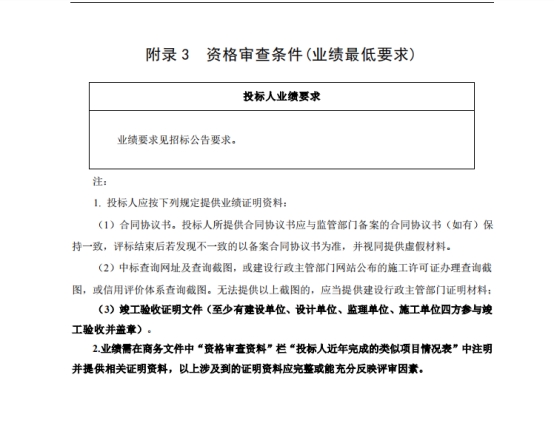 1、招标文件 附录3  资格审查条件:投标人应按下列规定提供业绩证明资料: 2)中标查询网址及查询截图,或建设行政主管部门网站公布的施工许可证办理查询截图,或信用评价体系查询截图。无法提供以上截图的,应当提供建设行政主管部门证明材料;