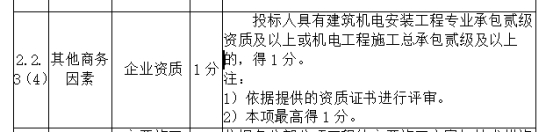 1、问:招标文件第65页,2.2.3(4)投标人具有建筑机电安装工程专业承包贰级资质及以上的,得 1 分。注:1)依据提供的资质证书进行评审。2)本项最高得 1 分。