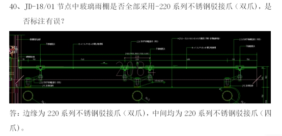 疑问18:B1楼幕墙玻璃雨棚中图纸采用250系列不锈钢驳接爪系列,清单中描述为220系列。是否有误?