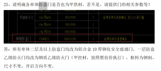 疑问19:答疑中提到:防火门为甲供材,那么一层的防火防盗门、二层以上的铝合金 10 厚钢化安全玻璃门、门窗表中的钢制木纹门是否属于施工范围?
