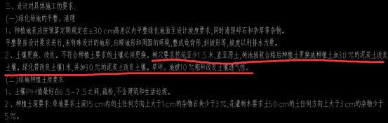 回复:草坪、地被种植土需掺10%粗砂改良土壤透气性,厚度30cm。