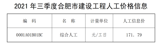 一、招标文件中对人工费单价未做明确要求,根据2021年10月份合肥建设工程市场价格信息公布的2021年三季度合肥市建设工程人工价格为171.79元/工日(如图),请问投标单位是否可以直接采用此信息价编制投标文件?