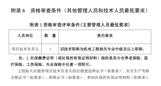 1.招标文件提供的“附录 6 资格审查条件(其他管理人员和技术人员最低要求)”内容如下: