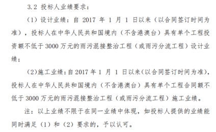 3.投标人资格要求和商务文件、技术文件详细评审中施工业绩:自2017年1 月 1 日以来(以合同签订时间为准),投标人在中华人民共和国境内(不含港澳台)具有单个工程合同额不低于3000万元的雨污混接整治工程(或雨污分流工程)施工业绩。