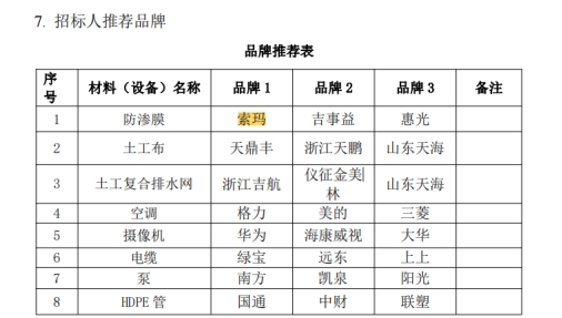 答:防渗膜推荐品牌调整为索玛、吉事益、惠光、阿塔菲;其他按招标文件执行。