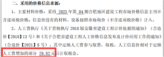 13.最高投标限价总说明“第二、2条,其中定额人工费参与取费、取税,人工信息价相对于定额人工费增加的部分29.82元只计取税金。”而2023年第04期合肥地区建设工程市场价格信息主刊的第2页,人工费增加的部分为29.84元。请问,以何为准?
