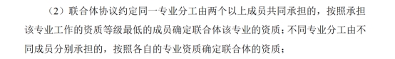 回复:联合体协议约定同一专业分工由两个以上成员共同承担的,按照承担该专业工作的资质等级最低的成员确定联合体该专业的资质;不同专业分工由不同成员分别承担的,按照各自的专业资质确定联合体的资质。