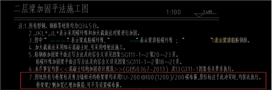 答:框架梁2侧加宽已增加箍筋,可不另设置碳布箍。其余所有框架梁均设置,梁尺寸详见梁补图。