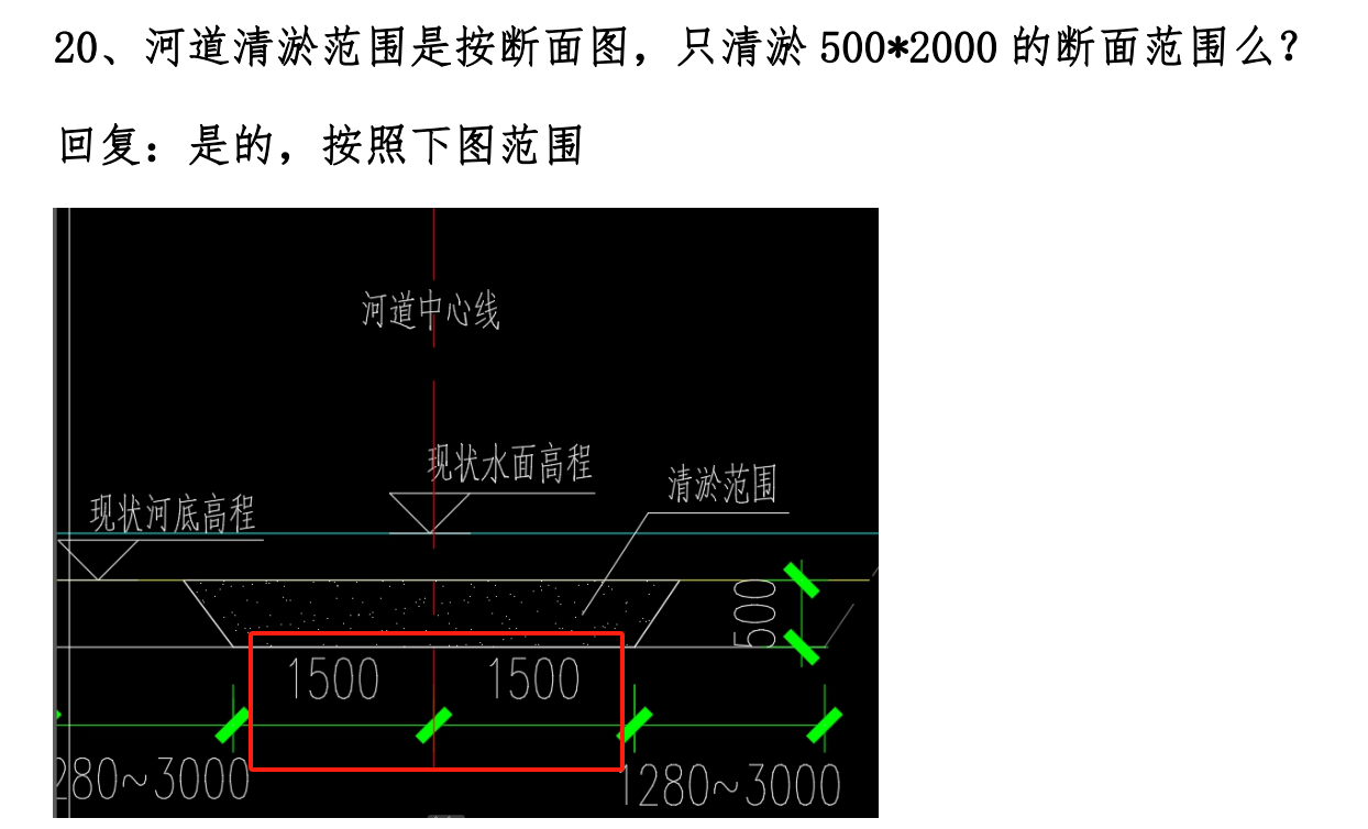3、请问补疑1中的第20条答疑答复是否有误,清淤断面范围应为500*3000,清淤工程量请复核后调增。