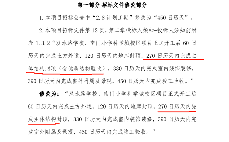 3. 根据补疑中“第二章投标人须知-投标人须知前附表 1.3.2“双水路学校、南门小学科学城校区项目正式开工后 60日历天内完成土方外运,120 日历天内地库封顶,270日历天内完成主体结构封顶(含优质结构验收),330日历天内完成室内装饰装修,”修改为“双水路学校、南门小学科学城校区项目正式开工后60日历天内完成土方外运,120日历天内地库封顶,270日历天内完成主体结构封顶,330日历天内完成室内装饰装修,390日历天内完成室外附属及景观,450 日历天内完成竣工验收。”