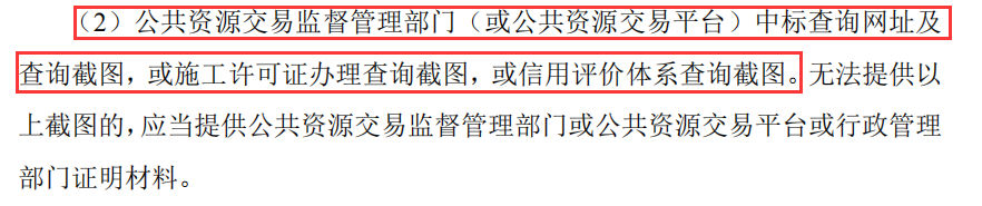 (2)公共资源交易监督管理部门(或公共资源交易平台)中标查询网址及查询截图,或施工许可证办理查询截图,或信用评价体系查询截图。无法提供以上截图的,应当提供公共资源交易监督管理部门或公共资源交易平台或行政管理部门证明材料。
