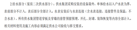答:本次招标项目包含4#楼给水部分相关的设施设备、管道、阀门等施工内容,市政直供水管系统以入户总阀门为界(含总阀),加压供水系统以市政水表为界(含水表和水表井)。
