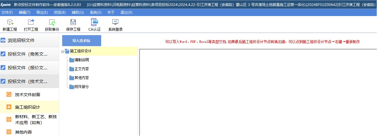 4.新点投标文件制作软件中技术文件施工组织设计只有一个版块上传,根据招标文件P61页技术文件评审标准分为运营能力、运营方案、运营效益分析、施工组织设计方案4个子项分别评审。