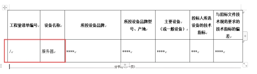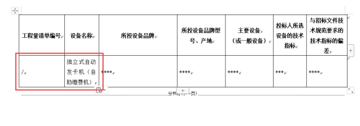 2.因清单控制价中标注的*号设备等名称会与招标文件附表2设备名称有差异,故针对“(四)带号设备品牌型号汇总与指标偏离表”的相关制作现要求如下:(1)表格中工程量清单编号处用“/”表示;(2)设备名称处填写的内容以招标文件附表2设备类型的表述为准,即若是“服务器”则在设备名称处填写“服务器”,若是“独立式自动发卡机(自助缴费机)”则在设备名称处填写“独立式自动发卡机(自助缴费机)”。图例如下: