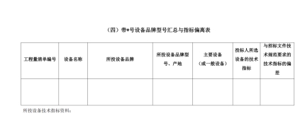 招标文件附件“(四)带*号设备品牌型号汇总与指标偏离表”格式如下: