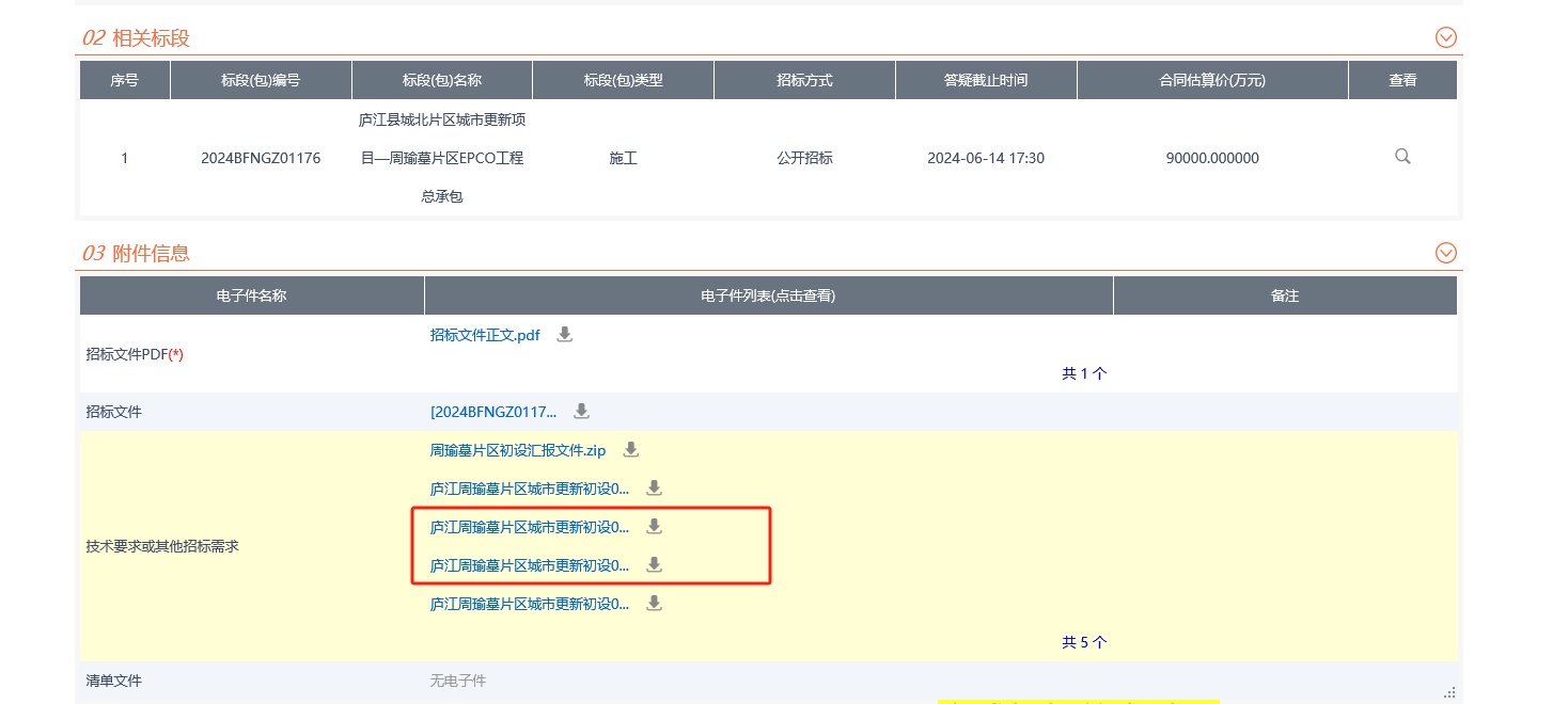1.我单位拟参与“庐江县城北片区城市更新项目—周瑜墓片区EPCO工程总承包”项目投标,在招标文件下载中遇到以下资料无法下载“庐江周瑜墓片区城市更新初步设计02”号、“庐江周瑜墓片区城市更新初步设计03”号,请处理!
