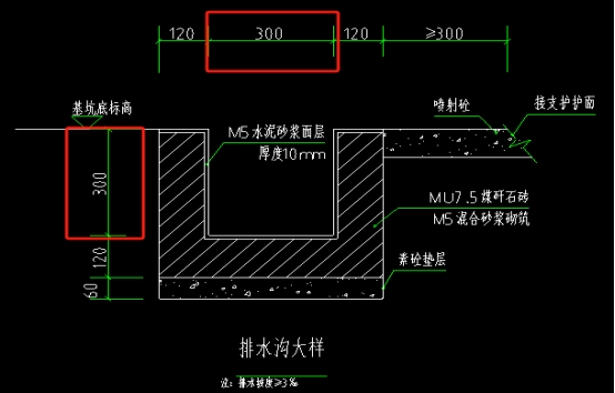 2.基坑支护04-A1中设计砖砌排水沟尺寸为300*300mm,清单要求300*200mm,请明确具体尺寸。