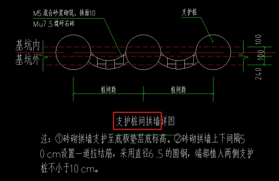 5.请明确基坑支护04-A1图中桩间拱墙施工是否先开挖至基坑底部,然后再由下至上砌筑,还是先分层分段开挖砌筑,设置腰梁,若由上至下施工,请明确腰梁做法。