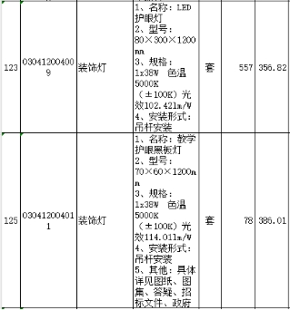 25.清单中LED护眼灯80×300×1200mm,规格:1x38W色温5000K(±100K)光效102.42lm/W, 综合单价为356.82元/套;教学护眼黑板灯70×60×1200mm,规格:1x38W色温5000K(±100K)光效114.01lm/W,综合单价为386.01元/套;招标提供的品牌参考表中护眼灯品牌为:科盟、立达信、多能者。经市场询价后,三种品牌护眼灯的价格远远超出招标控制价,按控制价的金额采购不到推荐品牌中的护眼灯;