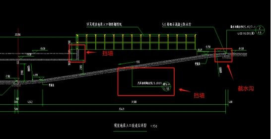 9.景观-09中只体现坡道改造示意图,请补充汽车坡道口截水沟、挡墙、汽车坡道的具体尺寸及配筋等具体做法。