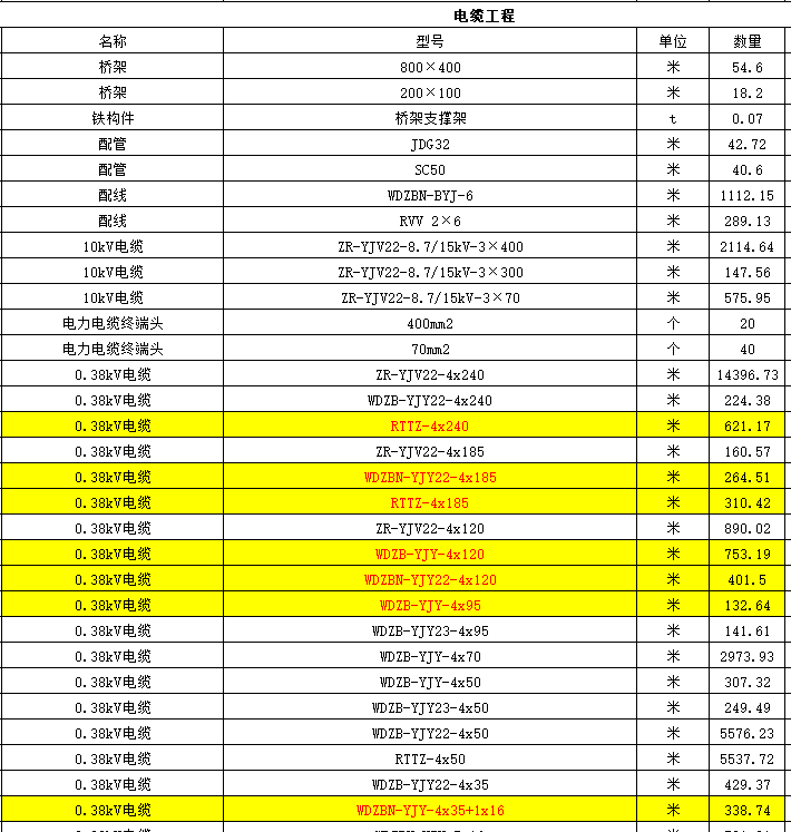 4.清单中电表间电缆缺少WDZB-YJY-4x120+1x70型号电缆工程量?