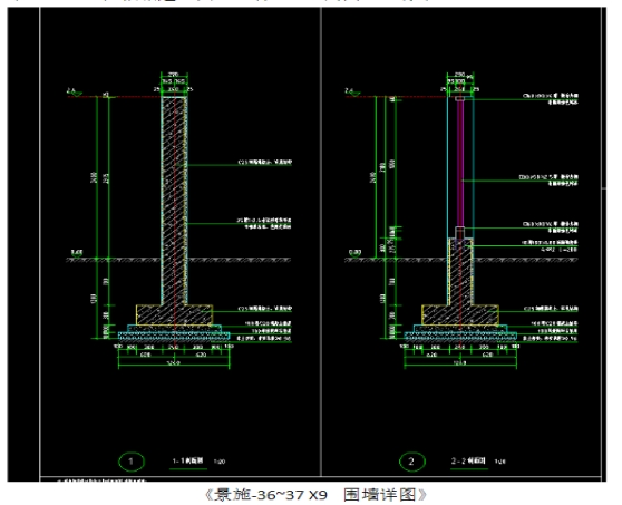65.室外景观工程《景施-36~37 X9 围墙详图》基础做法与《景观-结构》做法不一致,结构图只有1-1剖面有带型基础,但根据建施图可以看出2-2剖面也是有带型基础的,且基础应该是通长的 请明确?