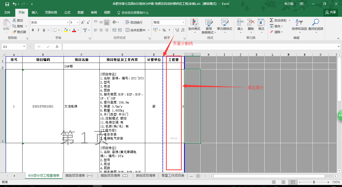1、导入EXCEL已标价工程量清单时,请保持表格内的宽度不超过一页。超过一页部分会被切割开,并自动附到文档最后,造成内容不连贯(也可以通过打印预览查看宽度是否超过一页)。如图所示: