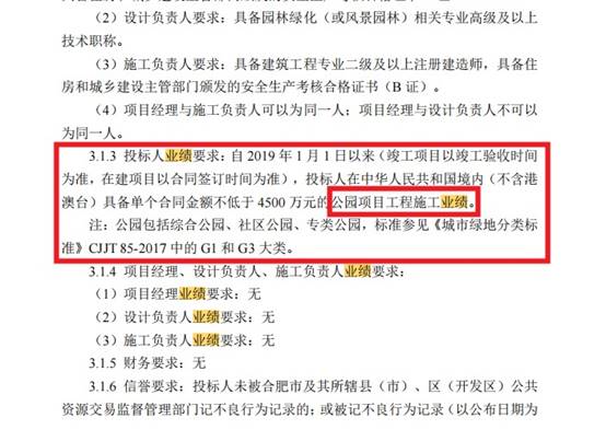 3.投标人业绩要求:自2019年1月1日以来(竣工项目以竣工验收时间为准,在建项目以合同签订时间为准),投标人在中华人民共和国境内(不含港澳台)具备单个合同金额不低于4500万元的公园项目工程施工业绩。
