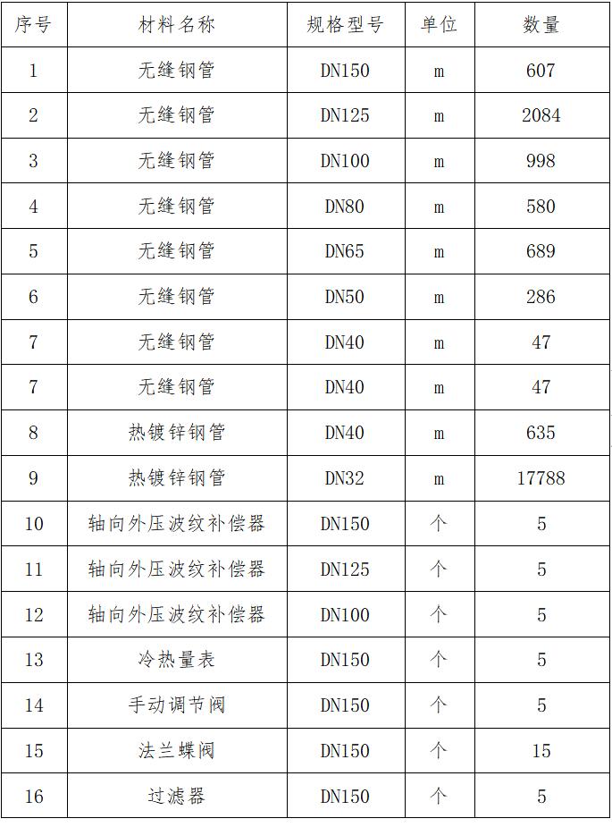 1.1主要内容为:拆除和新建DN150无缝钢管607米、DN125无缝钢管2084米,DN100无缝钢管998米,DN80无缝钢管580米,DN65无缝钢管689米,DN50无缝钢管286米,DN40无缝钢管47米,DN40热镀锌钢管635米,DN32热镀锌钢管17788米。