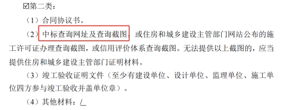 (2)中标查询网址及查询截图,或建设行政主管部门网站公布的施工许可证办理查询截图,或信用评价体系查询截图。无法提供以上截图的,应当提供建设行政主管部门(或供电公司)证明材料。