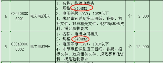 4.招标清单中“第4、5项”电缆电缆头(中间接头),规格:240㎜2。此项目中未见该规格电缆,规格是否应为400㎜2。请招标人予以明示?