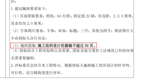 6、投标文件中仅规定了施工组织设计的页数要求,对于其他部分内容或者总页数有无页数数量的要求?电子标有无大小要求?