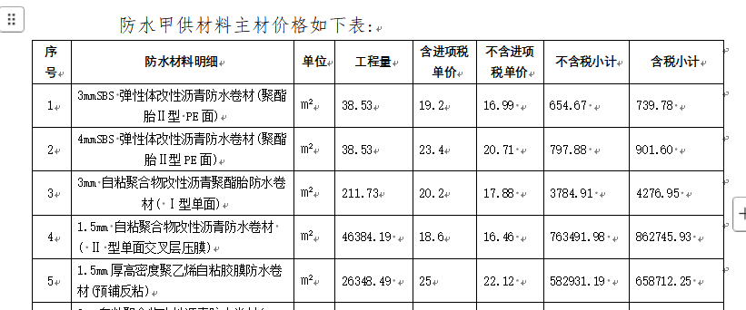 2标段中1.5mm单组分聚氨酯防水涂料Ⅰ型清单工程量4137平方米,对应的1.5mm单组分聚氨酯防水涂料Ⅰ型甲供材工程量为10549.35kg;2mm单组分聚氨酯防水涂料Ⅰ型清单工程量29118.3平方米,对应的2mm单组分聚氨酯防水涂料Ⅰ型甲供材工程量为99002.22kg;2mm厚双组份聚合物防水砂浆I型清单工程量8344.53平方米,对应的2mm厚双组份聚合物防水砂浆I型甲供材工程量为33378.12kg。