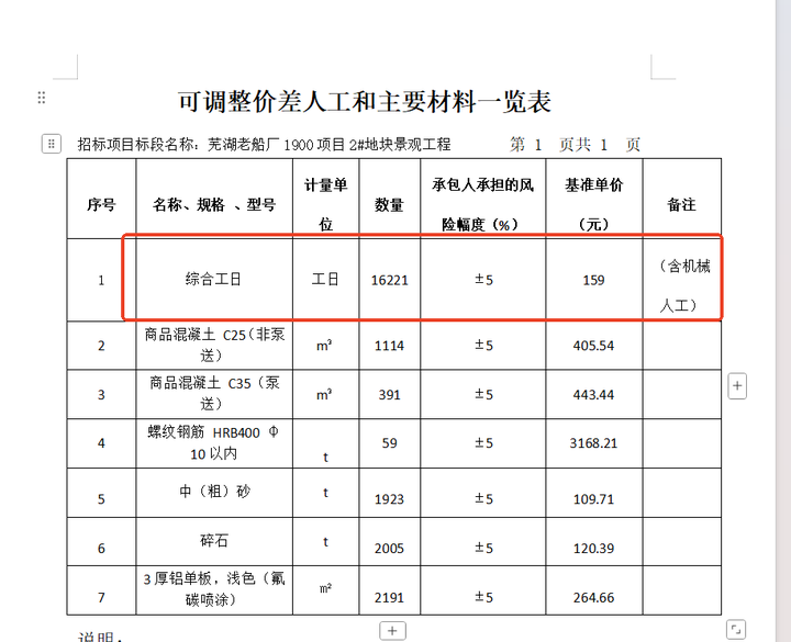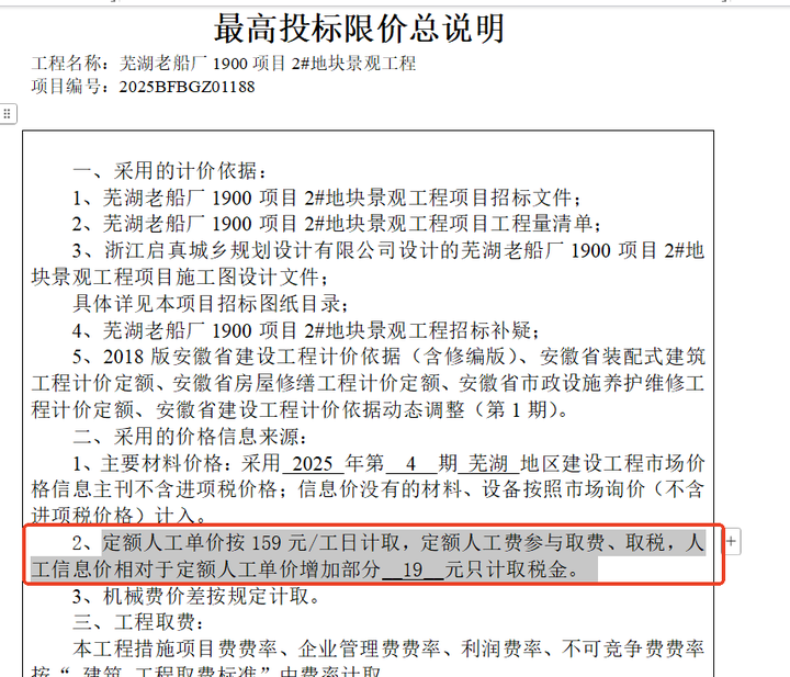 3.“可调整价差人工和主要材料一览表”综合工日基准单价为159元与“最高投标限价总说明”中的“定额人工单价按159元/工日计取,定额人工费参与取费、取税,人工信息价相对于定额人工单价增加部分19元只计取税金”描述不符,请问以哪个为准?