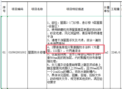 2.“滨湖院区门诊医技楼改造”单位工程的清单第61条“屋面防水修缮”中的“4、2厚高强单组分聚氨酯防水涂料(外露型,III型),分两遍滚涂”未写“主材甲供”,并且在6.23补遗第二条招标需求之3.1材料、设备主材价格表中未列出名称及工程量,请核实。