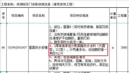 3.“滨湖院区门诊医技楼改造”单位工程的清单第66条“屋面防水修缮”中的“4、2厚高强单组分聚氨酯防水涂料(外露型,III型),分两遍滚涂,沿硅酮胶缝一侧各5公分”未写“主材甲供”,并且在6.23补遗第二条招标需求之3.1材料、设备主材价格表中未列出名称及工程量,请核实。